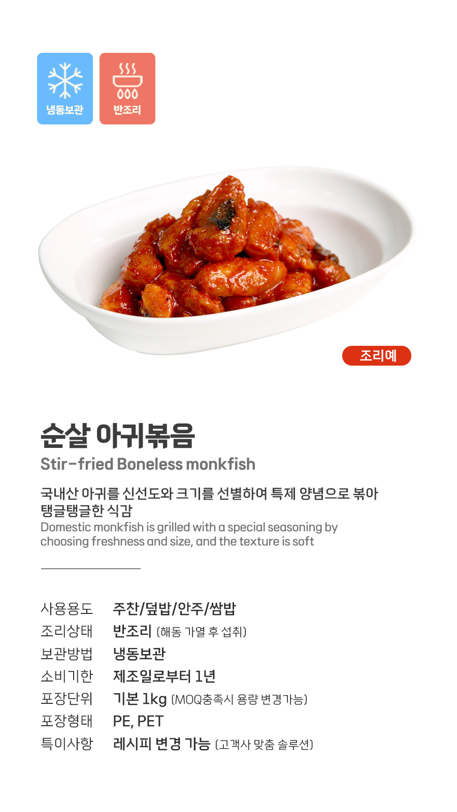 국내산 아귀를 신선도와 크기를 선별하여 특제 양념으로 볶아 탱글탱글한 식감