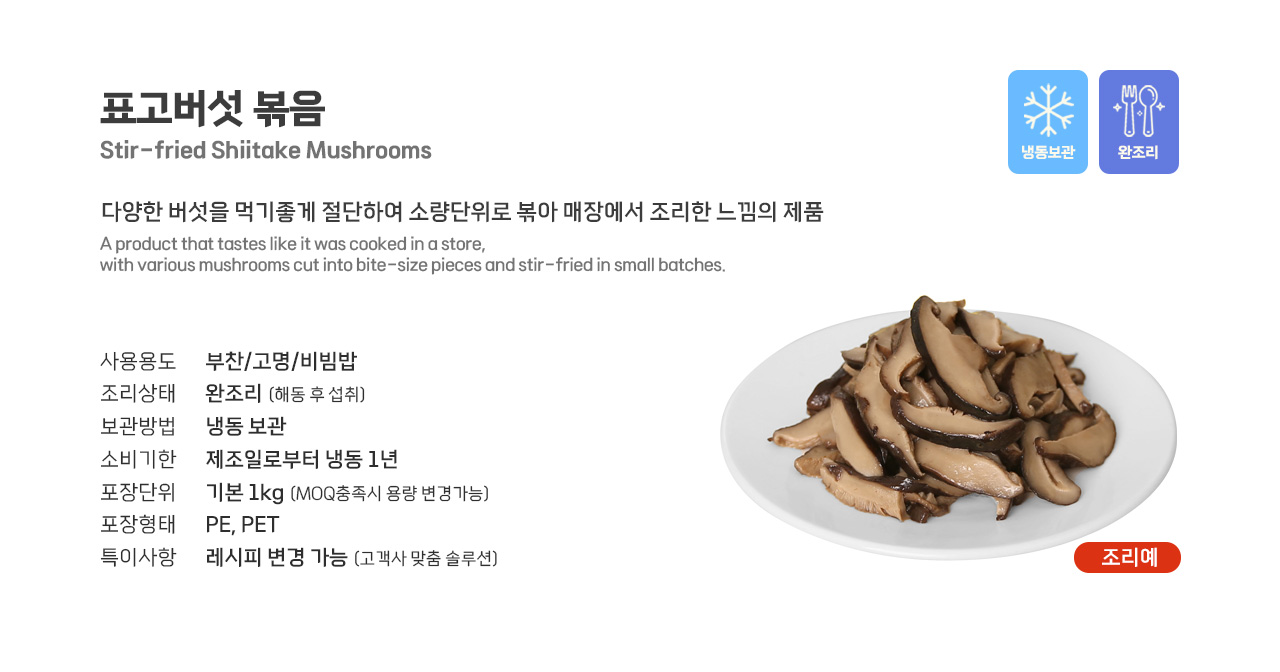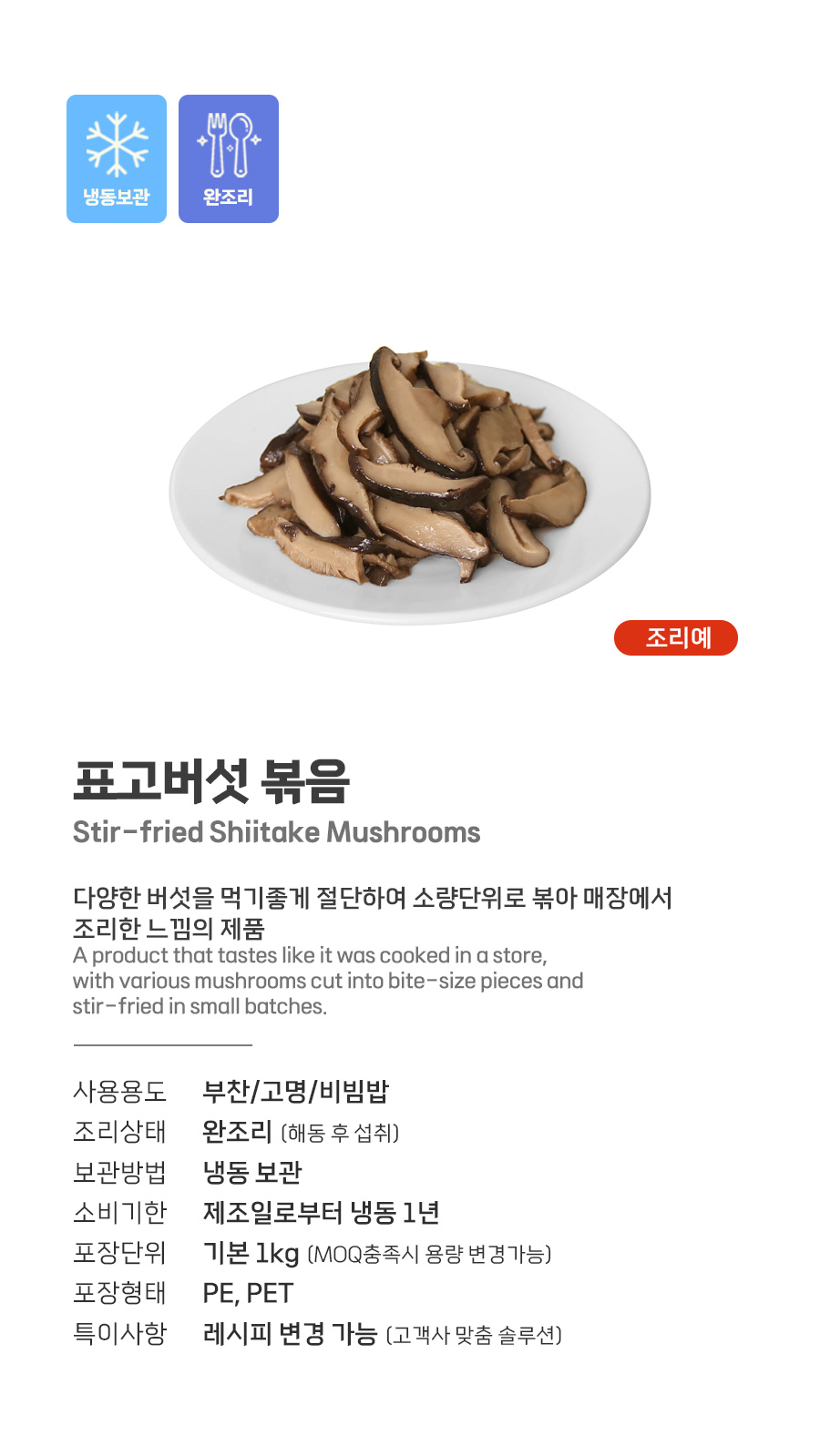 다양한 버섯을 먹기좋게 절단하여 소량단위로 볶아 매장에서 조리한 느낌의 제품