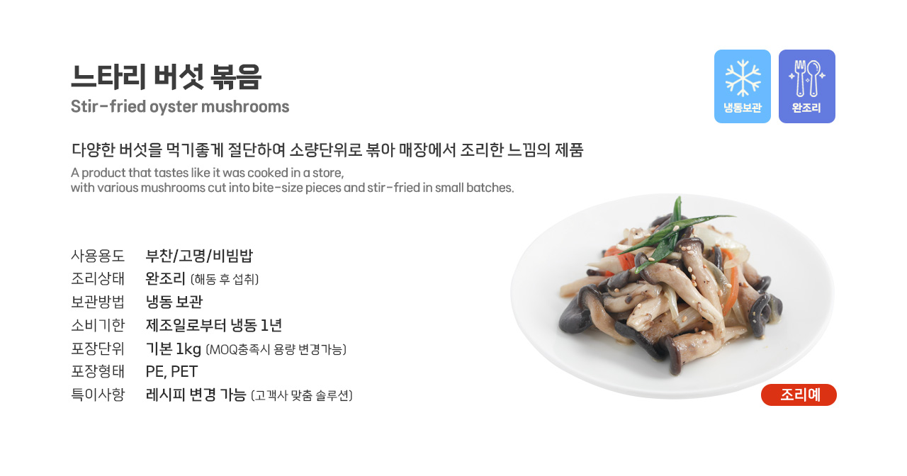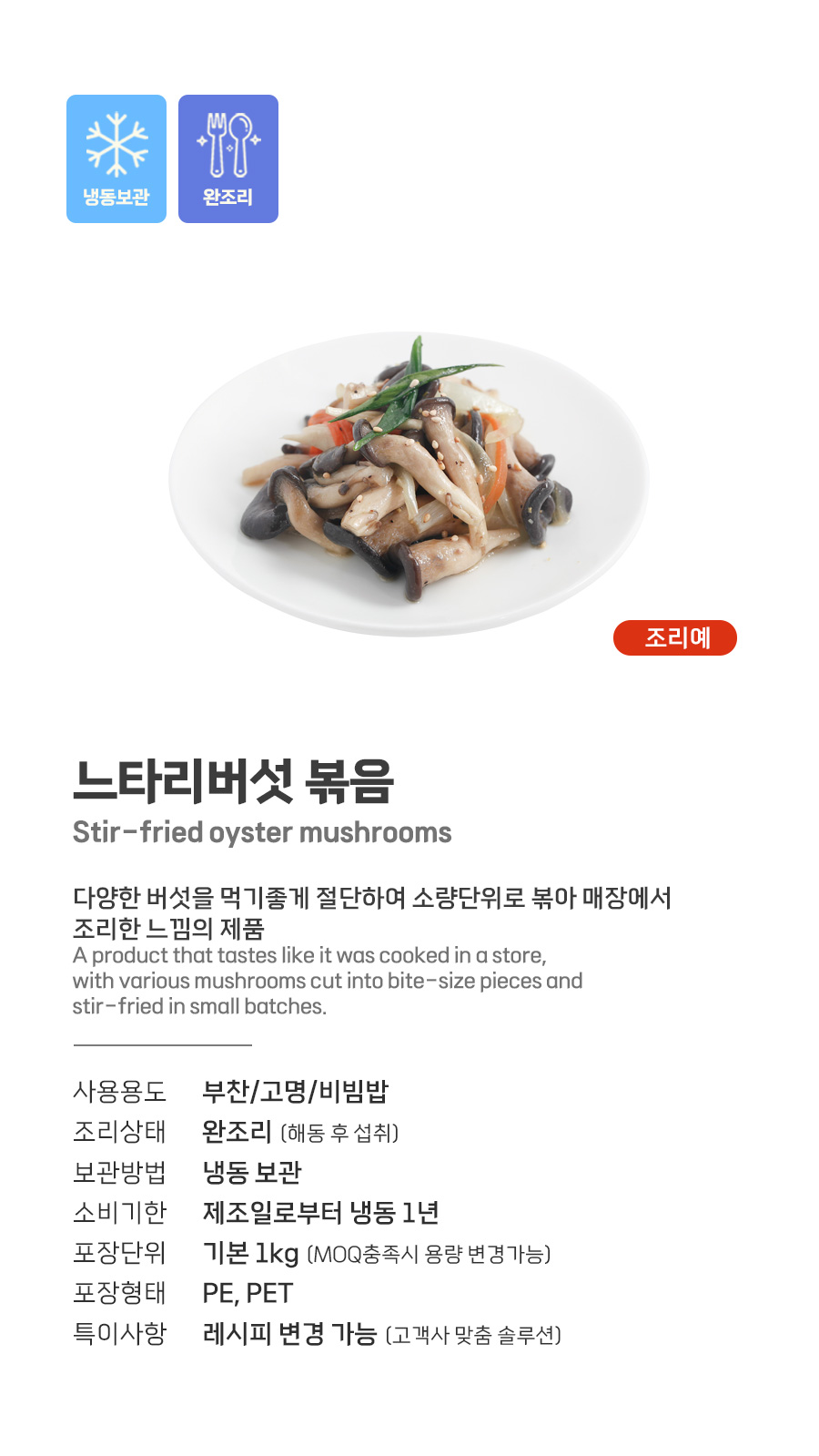 다양한 버섯을 먹기좋게 절단하여 소량단위로 볶아 매장에서 조리한 느낌의 제품